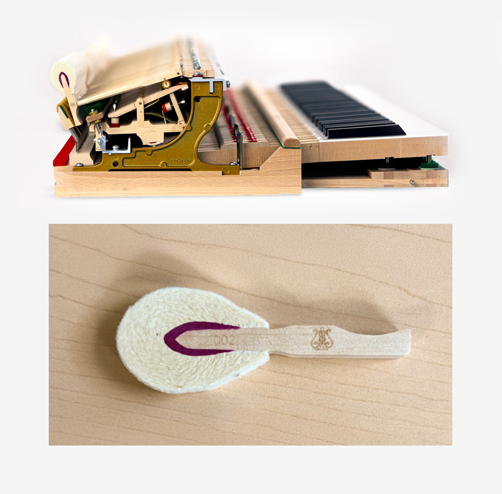 Boston grand pianos are equipped with specially developed hammers designed, engineered, and made by Steinway & Sons. These hammers, marked with the Steinway lyre, feature Weickert Special felt and hornbeam hammer moldings, with the signature purple underfelt color exclusive to Steinway. This innovative hammer design — unique to Boston pianos — allows for clear tone projection and a wide harmonic range.